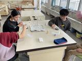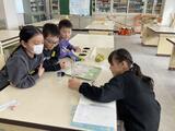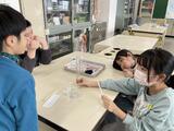 理科の学習では、食塩やミョウバンがどれだけ水に溶けるか実験しました。「50mLになっとるかな?」「今溶けたから記録して」とコミュニケーションをとりながら楽しく実験を進めました。水の量を増やしたり、水温を上げることでものの溶ける量が変化することを知り「だから温かい飲み物とかよく溶けるんかな」と学習したことを日常生活に繋げて考える様子も見られました。