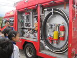 また、3人だけでしたが実際の消防服を着させてもらう体験もしました。3人には大きすぎましたが、とても頼もしい小さな消防士さんという感じで似合ってました。「重いの?」「とっても重いよ、動けない…」などの会話が聞こえてきました。子供たちから「火は怖くないですか?」という質問をした際に、「火事の現場はみんなが思っている以上に熱くて怖いです。でも、みなさんの命を守るために毎日訓練をして備えています」と話してくださいました。日頃から私たちの安全と命を守ってくださる大切なお仕事について、理解が深まりました。